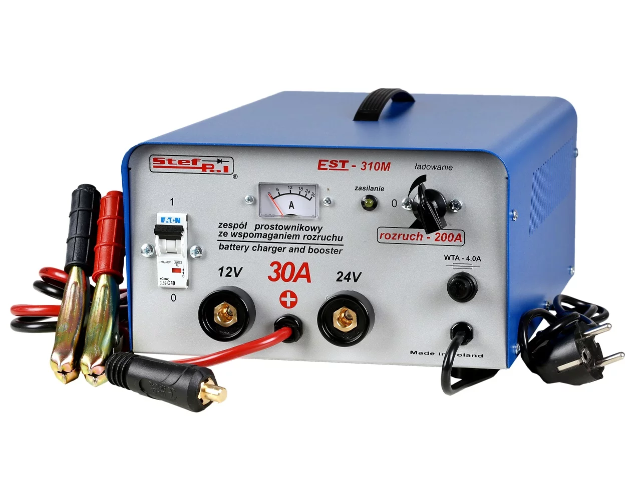 EST-310M 12V/24V/30AZespół Prostownikowy EST-310M jest przeznaczony do samoczynnego ładowania akumulatorów ołowiowo-kwasowych o napięciu 12V/24V i pojemności 70÷300Ah oraz do wspomagania rozruchu silnika.