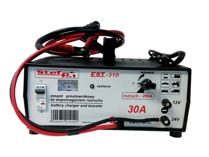 EST-310 12V/24V/30AZespół Prostownikowy EST – 310 jest przeznaczony do samoczynnego ładowania akumulatorów ołowiowo-kwasowych o napięciu 12V lub 24V i pojemności 70 ÷ 300Ah oraz do wspomagania rozruchu silnika.