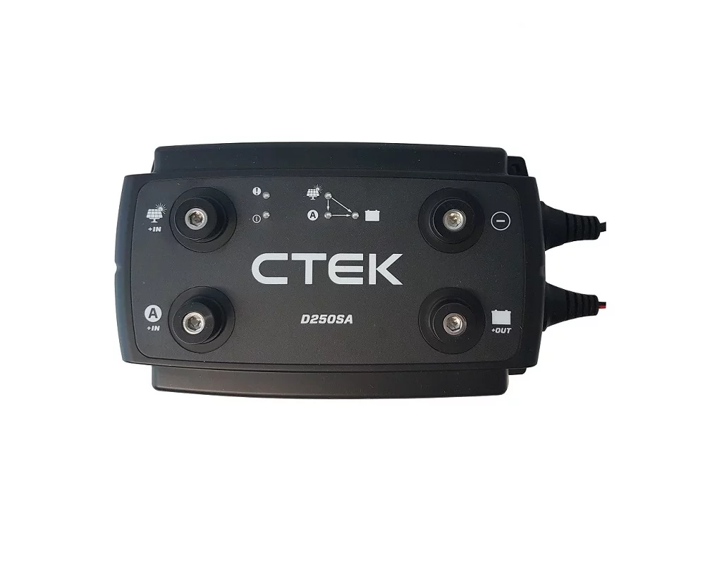 Ładowarka D250SA jest ładowarką akumulatorów typu "DC to DC" (prąd stały na prąd stały) dla układów z dwoma akumulatorami, z akumulatorem rozruchowym i akumulatorem serwisowym. Ładuje akumulator serwisowy z alternatora lub panelu solarnego albo z obu tych źródeł.