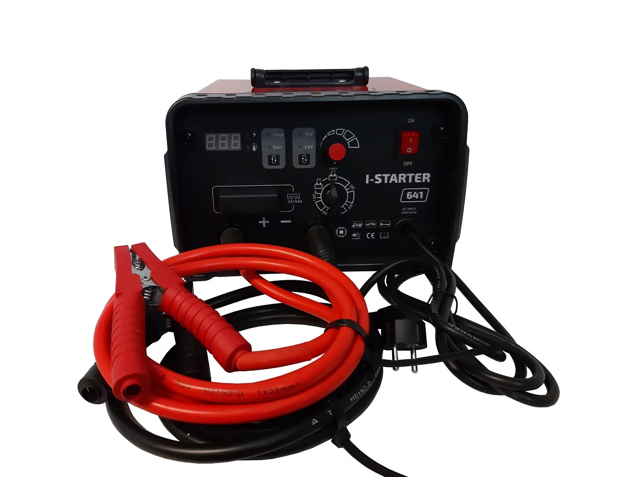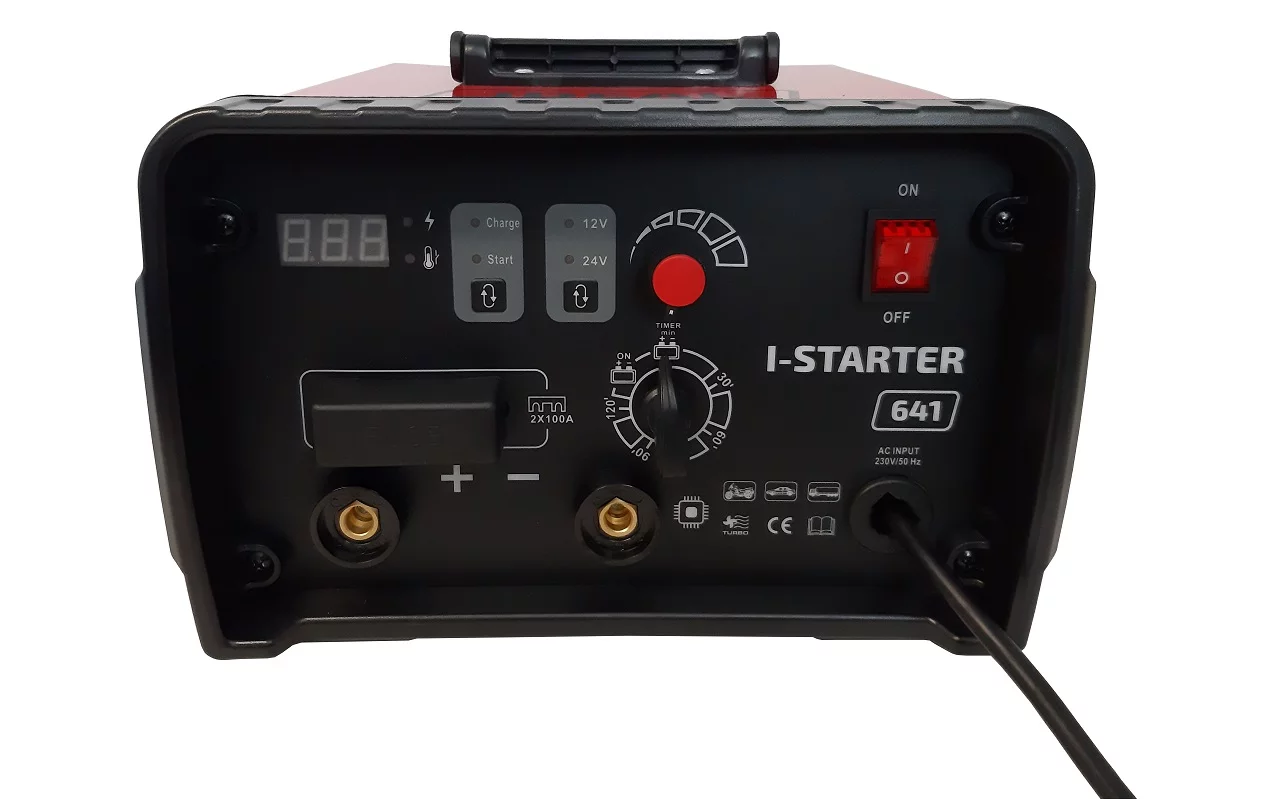 Inwertorowy prostownik do ładowania 12 i 24 woltowych akumulatorów kwasowych posiadający funkcję rozruchu. Zasilanie 230V, napięcie ładowania 12/24V, prąd ładowania 55A(12V) 60A(24V), prąd rozruchu 600A.I-STARTER 641 jest inwertorowym prostownikiem do ładowania 12 i 24 woltowych akumulatorów kwasowych, posiadający funkcję rozruchu samochodów z silnikami benzynowymi oraz diesla (w tym vanów, lekkich ciężarówek i traktorów).