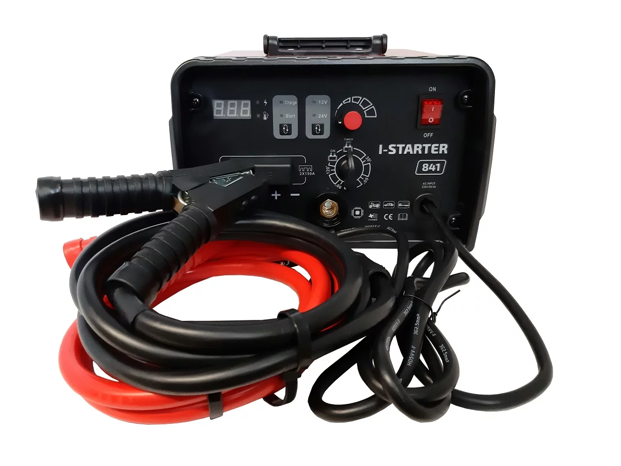 Inwertorowy prostownik do ładowania 12 i 24 woltowych akumulatorów kwasowych posiadający funkcję rozruchu. Zasilanie 230V, napięcie ładowania 12/24V, prąd ładowania 80A, prąd rozruchu 800A.I-STARTER 841 jest inwertorowym prostownikiem do ładowania 12 i 24 woltowych akumulatorów kwasowych, posiadający funkcję rozruchu samochodów z silnikami benzynowymi oraz diesla (w tym vanów, lekkich ciężarówek i traktorów).