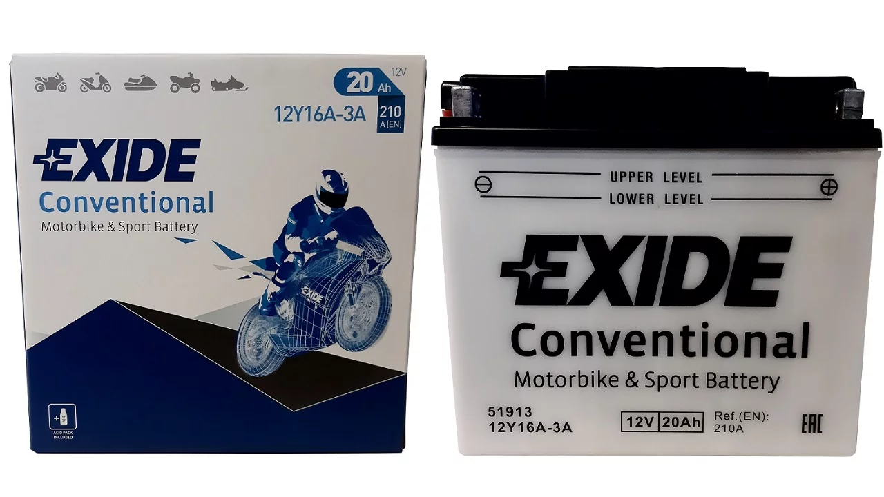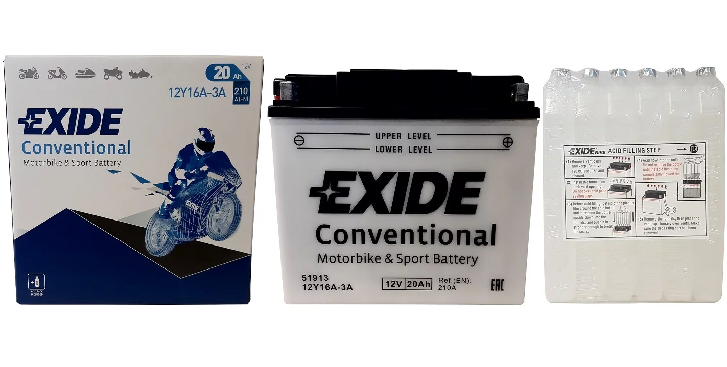 Exide dostarcza najwyższej jakości akumulatory do motocykli, zaprojektowane dla tych, którzy mają wysokie wymagania wobec swoich pojazdów. Do ich produkcji stosowane są najbardziej zaawansowane części i materiały dlatego są znane z niezawodności i doskonałej żywotności. Umożliwiają nie tylko pokonanie codziennej drogi do pracy ale również pozwalają na dotarcie do dalszych celów podróży, tych lądowych i morskich. Exide jest producentem oryginalnego sprzętu na tzw. pierwsze wyposażenie, dysponującym najbardziej nowoczesną technologią w branży.Akumulator Exide Conventional - został zaprojektowany w technologii ołowiowo - kwasowej na potrzeby podstawowych pojazdów oraz pojazdów starszego typu o podstawowym zapotrzebowaniu energetycznym. Akumulator Conventional sprawdzi się także w kosiarkach ogrodowych oraz w innych pojazdach tego typu.